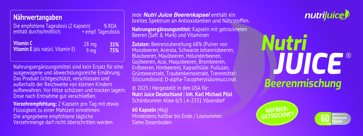 Zwei Kapseln der aktuellen Charge von Nutri Juice Beerenmischung enthalten 35 mg Vitamin C und Sie decken damit 60% des Tagesbedarfs ab.